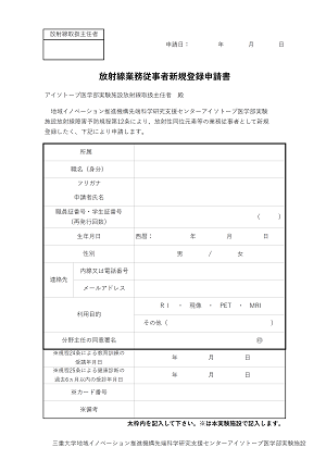 Excel形式はこちら PDF形式はこちら太枠内を記入して、アイソトープ医学部実験施設(以下、「RI医施設」という)へ提出してください。